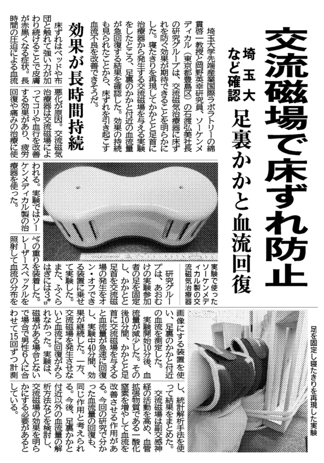 血流回復について埼玉大との研究グループの発表内容を床ずれを引き起こす血行不良の改善が期待できると掲載していただきました。